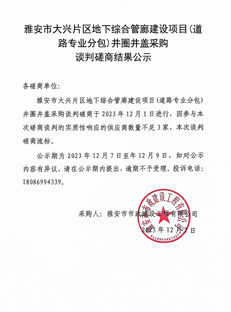 雅安市大興片區(qū)地下綜合管廊建設項目(道路專業(yè)分包)井圈井蓋采購談判磋商結果公示