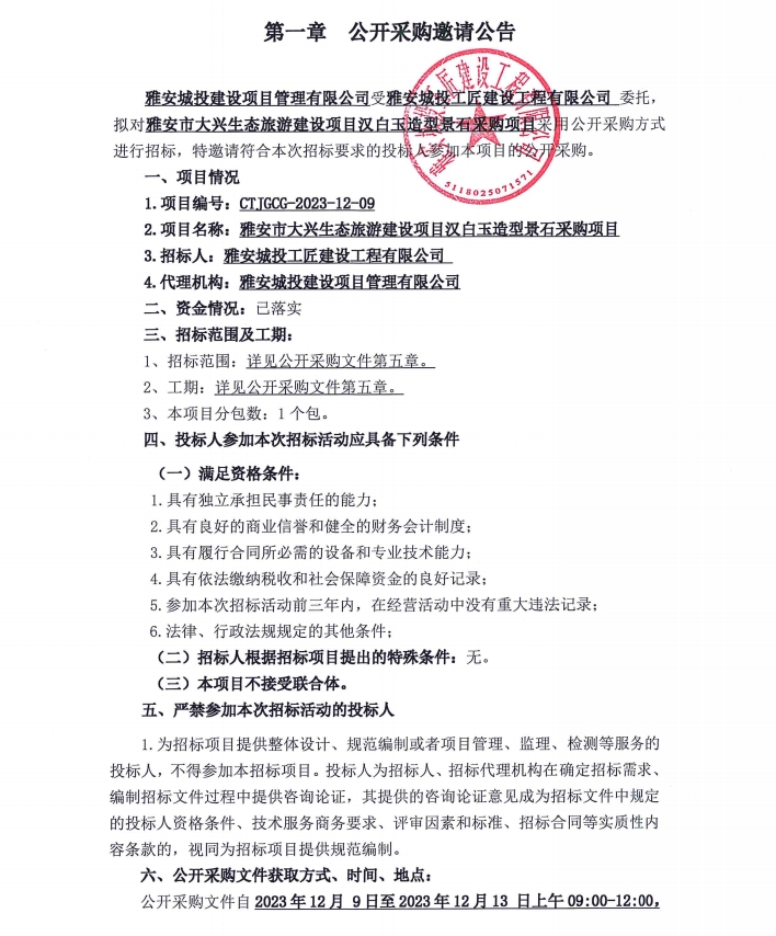 雅安市大興生態(tài)旅游建設項目漢白玉造型景石采購項目公開采購邀請公告