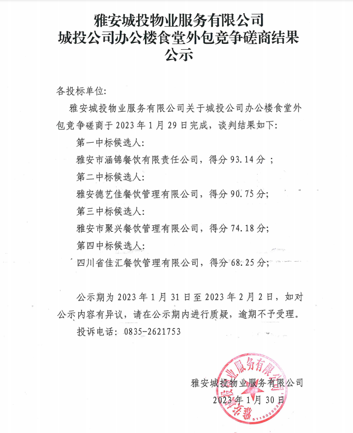 雅安城投物業(yè)服務有限公司城投公司辦公樓食堂外包競爭磋商結果公示