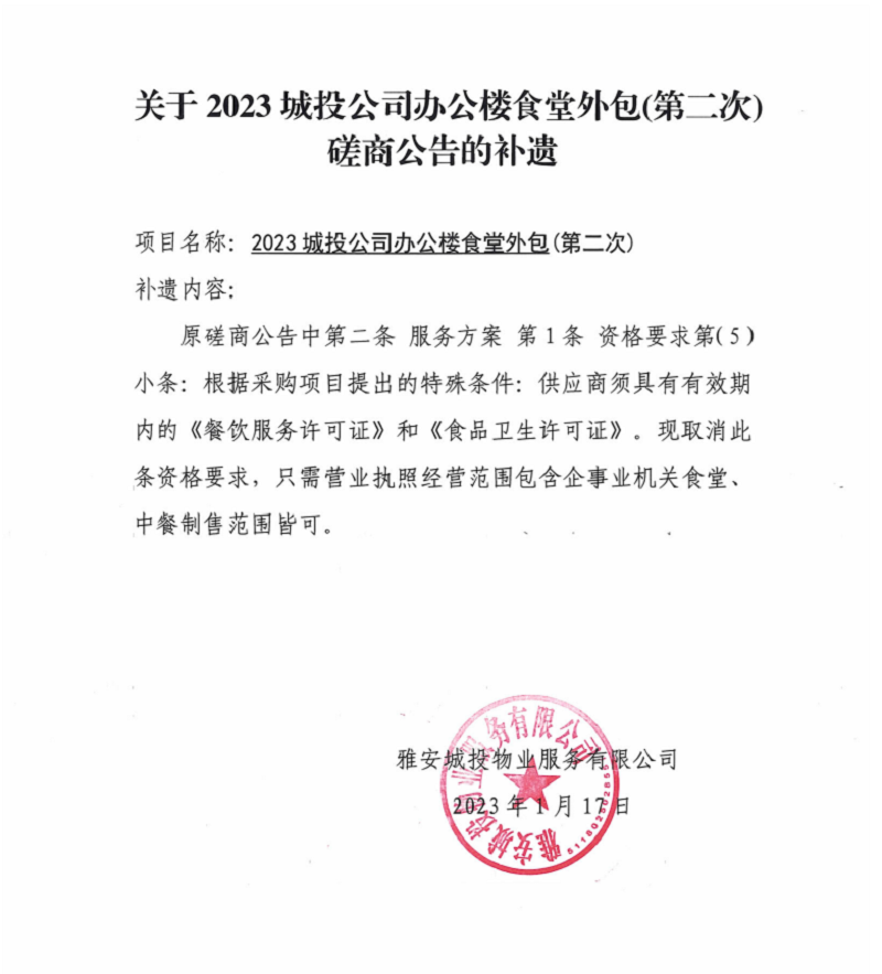 關(guān)于2023城投公司辦公樓食堂外包(第二次)項(xiàng)目競(jìng)爭(zhēng)磋商公告補(bǔ)遺