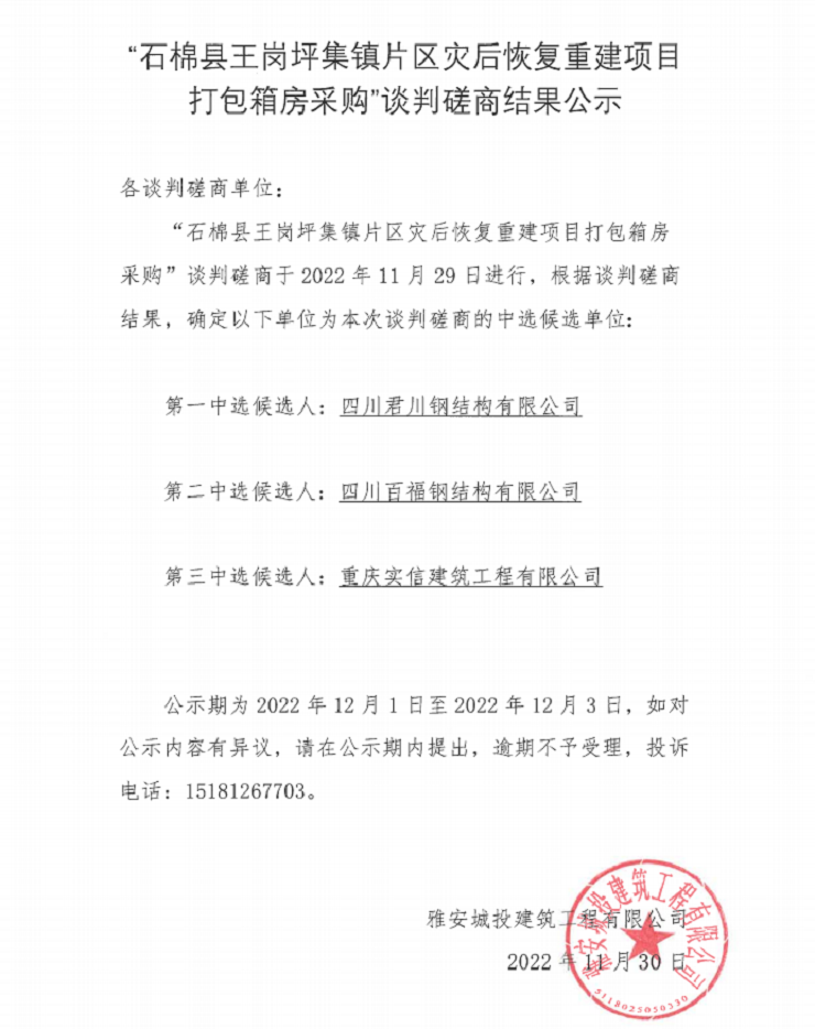 “石棉縣王崗坪集鎮(zhèn)片區(qū)災(zāi)后恢復(fù)·重建項(xiàng)目打包箱房采購”談判磋商結(jié)果公示