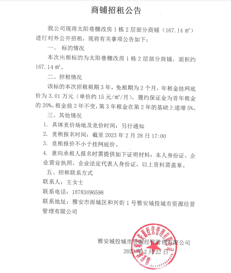 太陽巷棚改房1棟2層部分商鋪招租公告