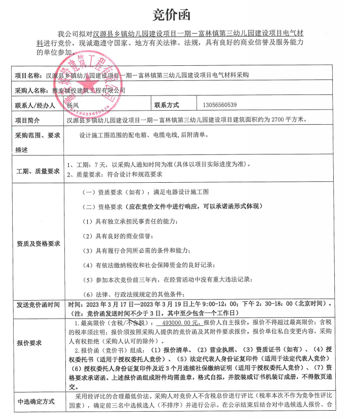 漢源縣鄉(xiāng)鎮(zhèn)幼兒園建設(shè)項目一期一富林鎮(zhèn)第三幼兒園建設(shè)項目電氣材料采購競價公告