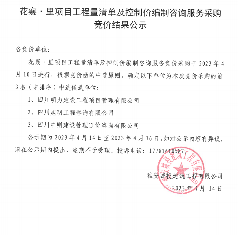 花襄·里項(xiàng)目工程量清單及招標(biāo)控制價(jià)編制咨詢(xún)服務(wù)采購(gòu)競(jìng)價(jià)結(jié)果公示