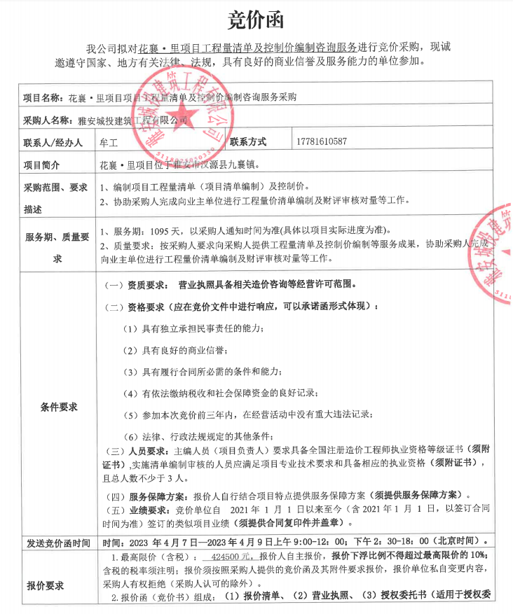 花襄·里項(xiàng)目工程量清單及招標(biāo)控制價(jià)編制咨詢服務(wù)采購競價(jià)公告