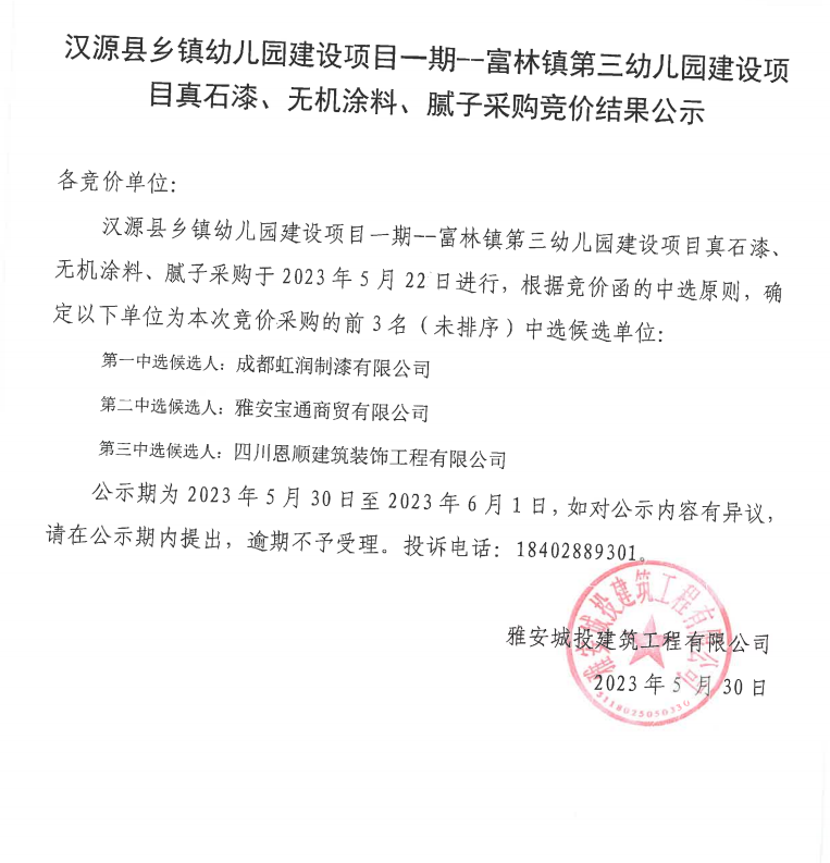 漢源縣鄉(xiāng)鎮(zhèn)幼兒園建設(shè)項目一期--富林鎮(zhèn)第三幼兒園建設(shè)項目真石漆、無機(jī)涂料、膩?zhàn)硬少徃們r結(jié)果公示