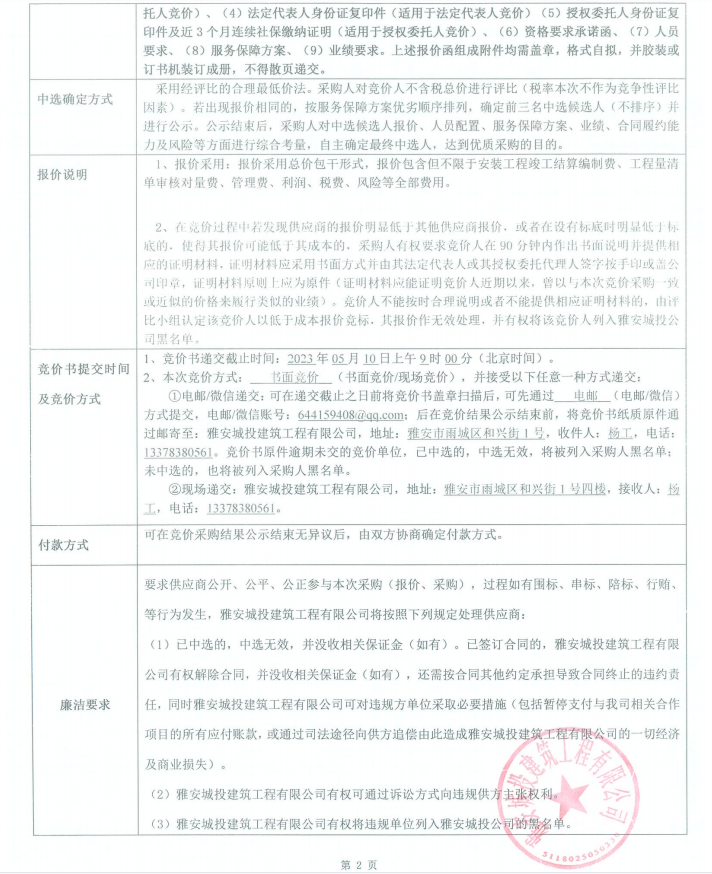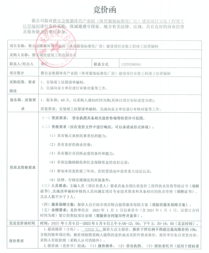 雅安金熊貓體育產(chǎn)業(yè)園(體育服裝標準化廠房)建設(shè)項目安裝工程竣工結(jié)算編制競價公告