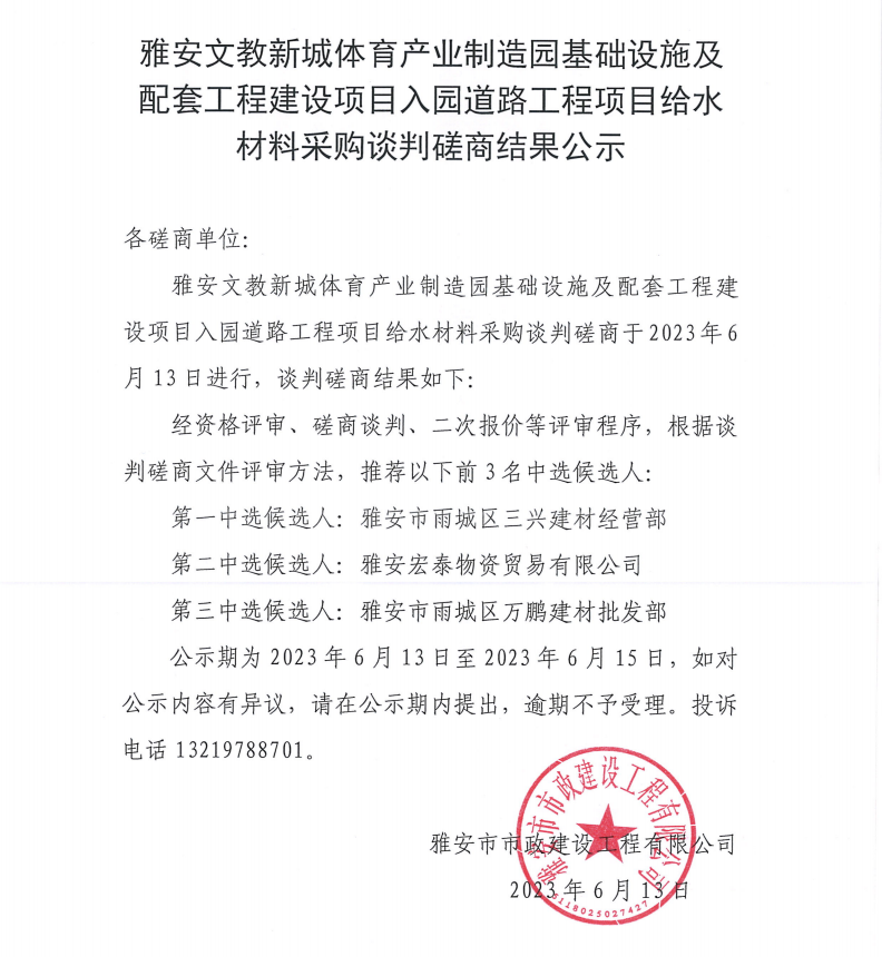 雅安文教新城體育產(chǎn)業(yè)制造園基礎(chǔ)設(shè)施及配套工程建設(shè)項(xiàng)目入園道路工程項(xiàng)目給水材料采購談判磋商結(jié)果公示
