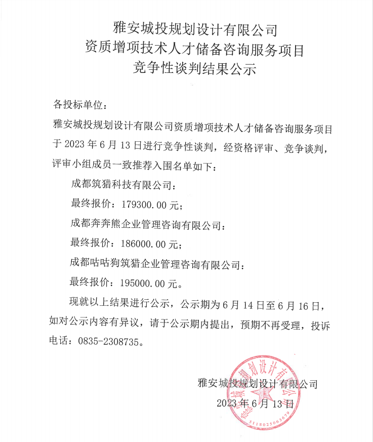 雅安城投規(guī)劃設(shè)計(jì)有限公司資質(zhì)增項(xiàng)技術(shù)人才儲(chǔ)備咨詢(xún)服務(wù)項(xiàng)目競(jìng)爭(zhēng)性談判結(jié)果公示