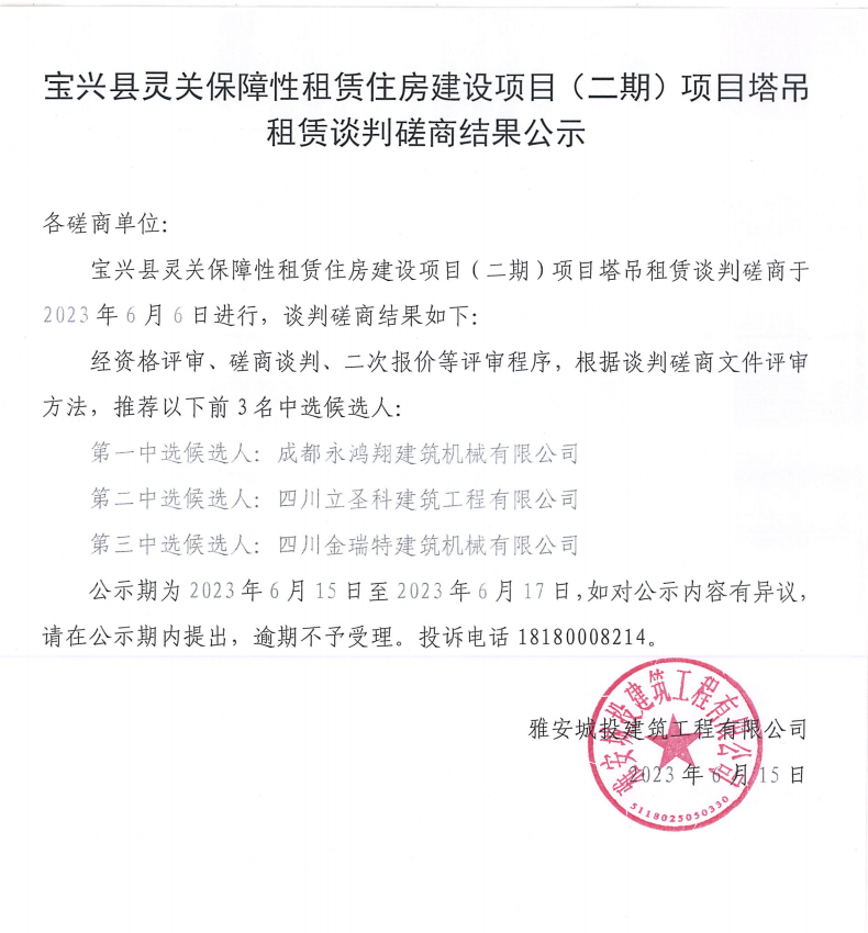 寶興縣靈關保障性租賃住房建設項目(二期)項目塔吊租賃談判磋商競價結果公示