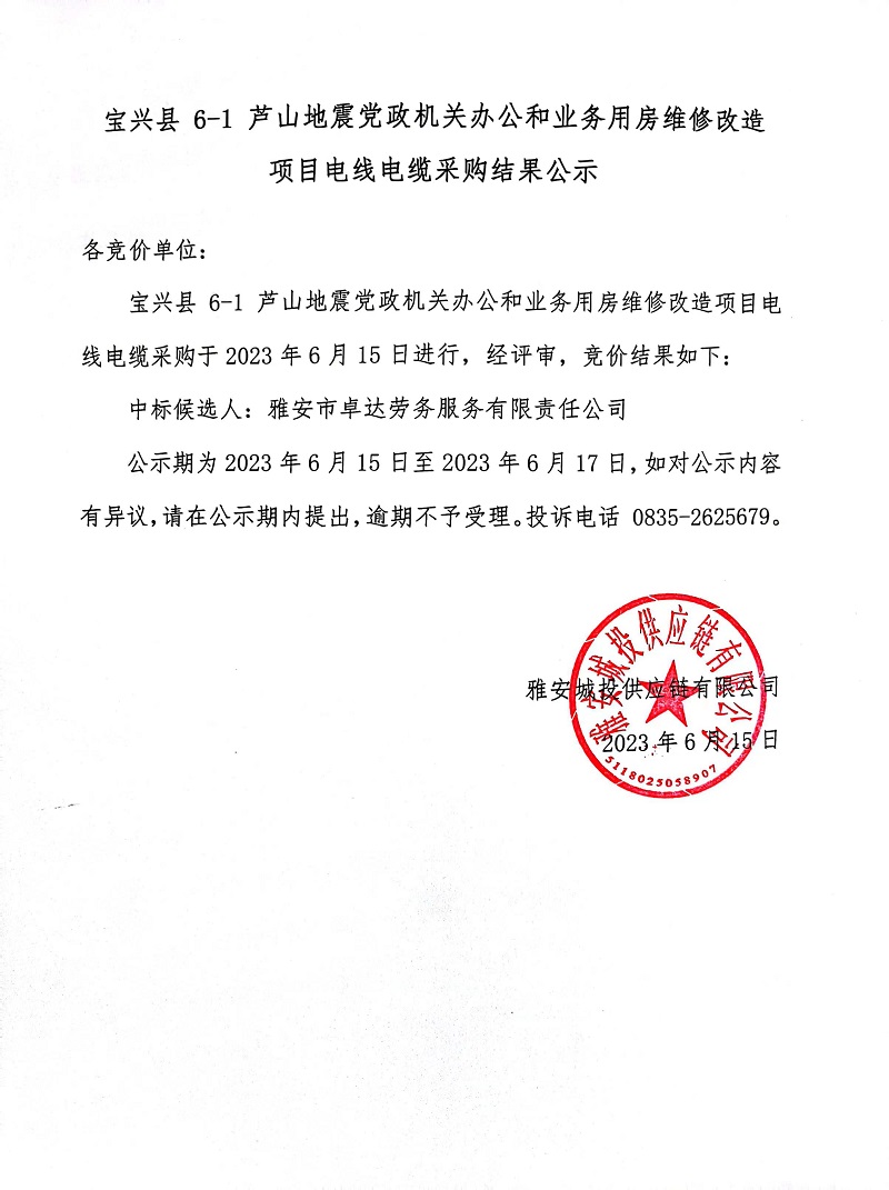 寶興縣 6-1 蘆山地震黨政機(jī)關(guān)辦公和業(yè)務(wù)用房維修改造項目電線電纜采購結(jié)果公示