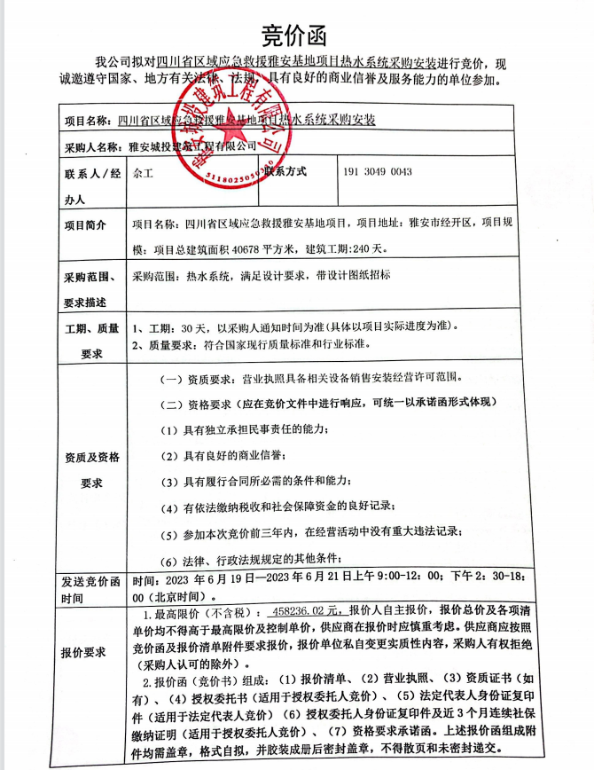 四川省區(qū)域應急救援雅安基地項目熱水系統(tǒng)采購安裝競價公告