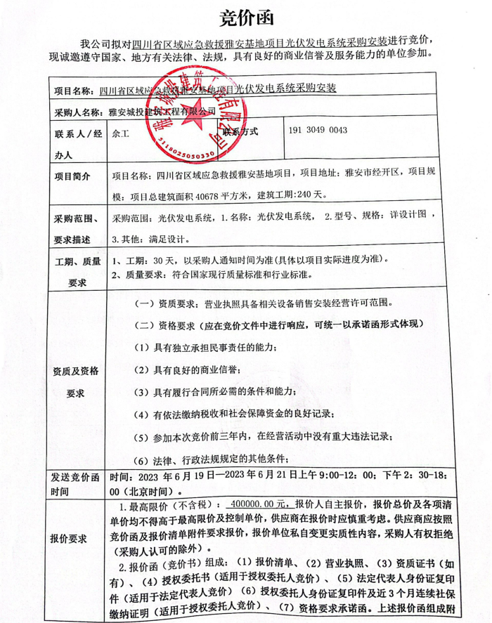 四川省區(qū)域應(yīng)急救援雅安基地項(xiàng)目光伏發(fā)電系統(tǒng)采購(gòu)安裝競(jìng)價(jià)公告