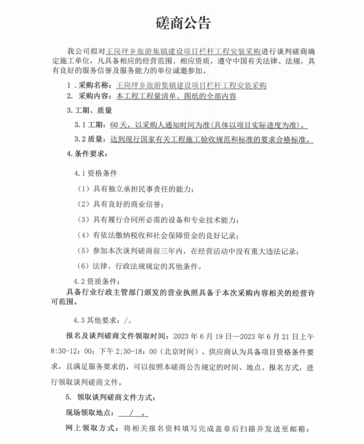 王崗坪鄉(xiāng)旅游集鎮(zhèn)建設項目欄桿工程安裝采購談判磋商公告