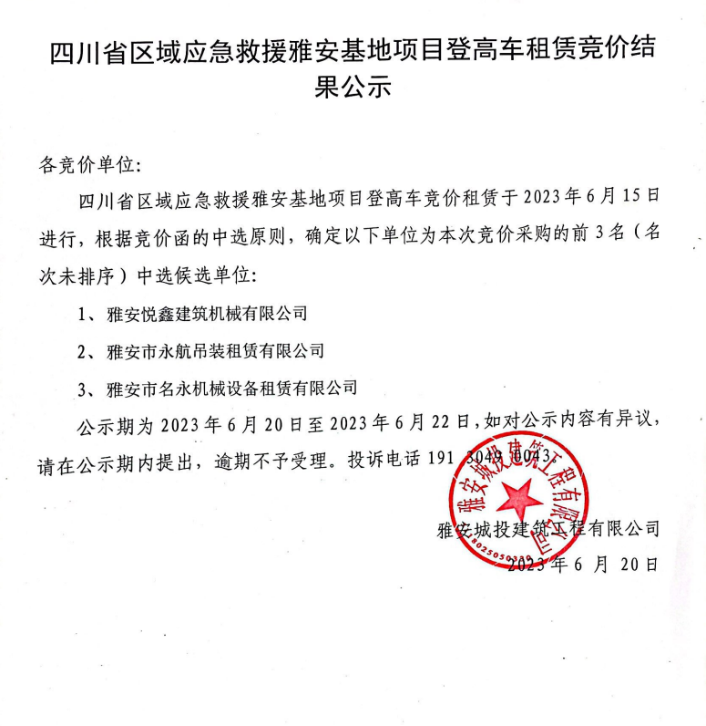 四川省區(qū)域應急救援雅安基地項目登高車租賃競價結果公示