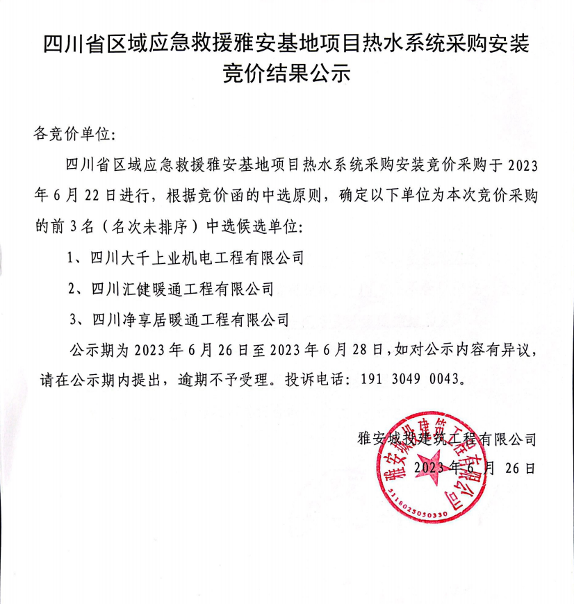 四川省區(qū)域應急救援雅安基地項目熱水系統(tǒng)采購安裝競價結果公示
