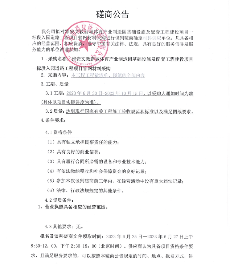 雅安文教新城體育產(chǎn)業(yè)制造園基礎(chǔ)設(shè)施及配套工程建設(shè)項(xiàng)目一標(biāo)段入園道路工程項(xiàng)目管網(wǎng)材料采購(gòu)談判磋商公告