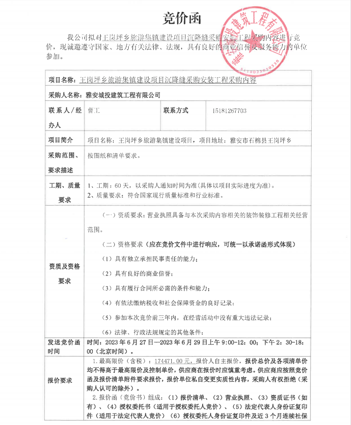 王崗坪鄉(xiāng)旅游集鎮(zhèn)建設(shè)項(xiàng)目沉降縫采購(gòu)安裝工程采購(gòu)內(nèi)容競(jìng)價(jià)公告