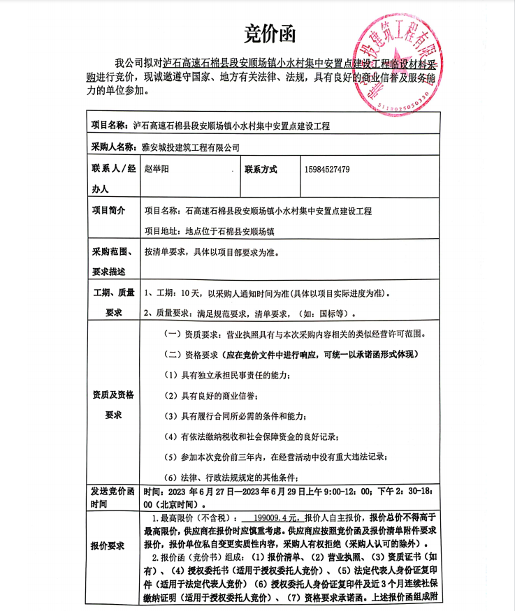 瀘石高速石棉縣段安順場鎮(zhèn)小水村集中安置點(diǎn)建設(shè)工程臨設(shè)材料采購競價(jià)公告
