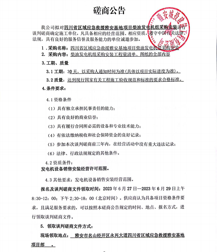 四川省區(qū)域應(yīng)急救援雅安基地項目柴油發(fā)電機(jī)組采購安裝談判磋商公告