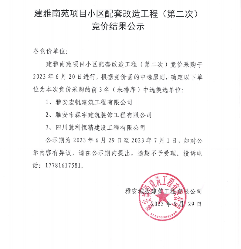 建雅南苑項(xiàng)目小區(qū)配套改造工程(第二次)競(jìng)價(jià)結(jié)果公示