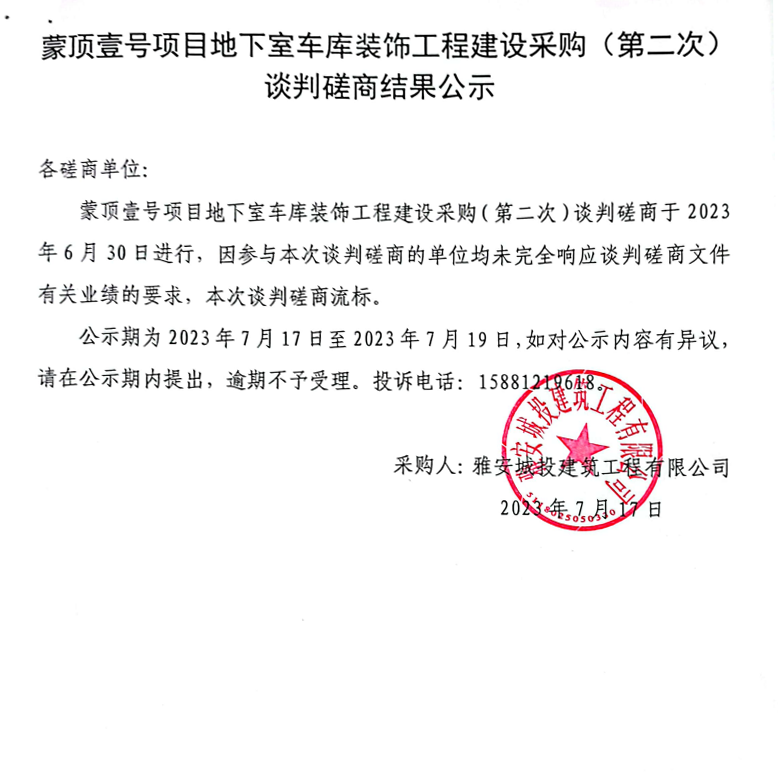 蒙頂壹號(hào)項(xiàng)目地下室車(chē)庫(kù)裝飾工程建設(shè)采購(gòu)(第二次)談判磋商結(jié)果公示
