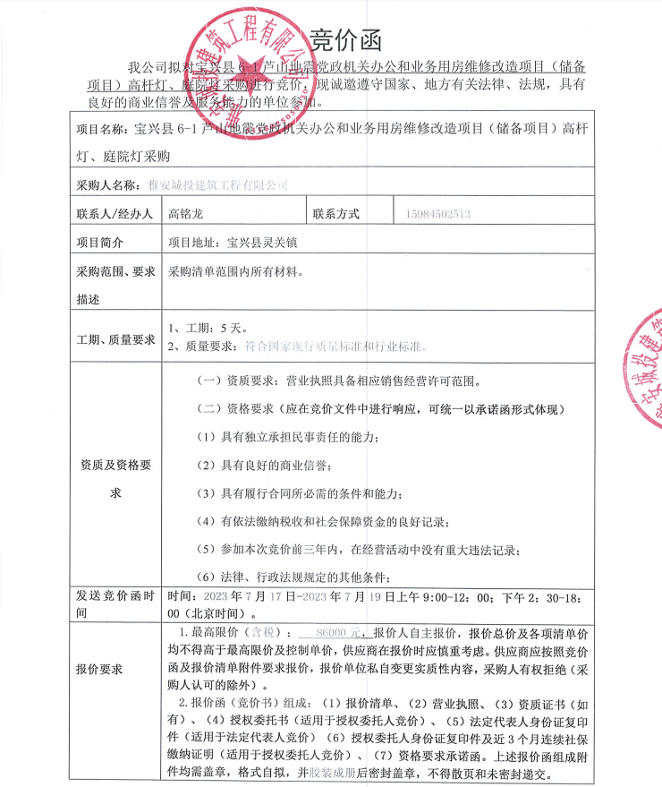 寶興縣6-1蘆山地震黨政機關(guān)辦公和業(yè)務(wù)用房維修改造項目(儲備項目)高桿燈、庭院燈采購競價公告