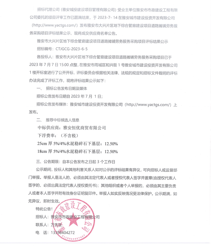 雅安市大興片區(qū)地下綜合管廊建設(shè)項(xiàng)目道路攤鋪勞務(wù)服務(wù)采購項(xiàng)目評標(biāo)結(jié)果公示