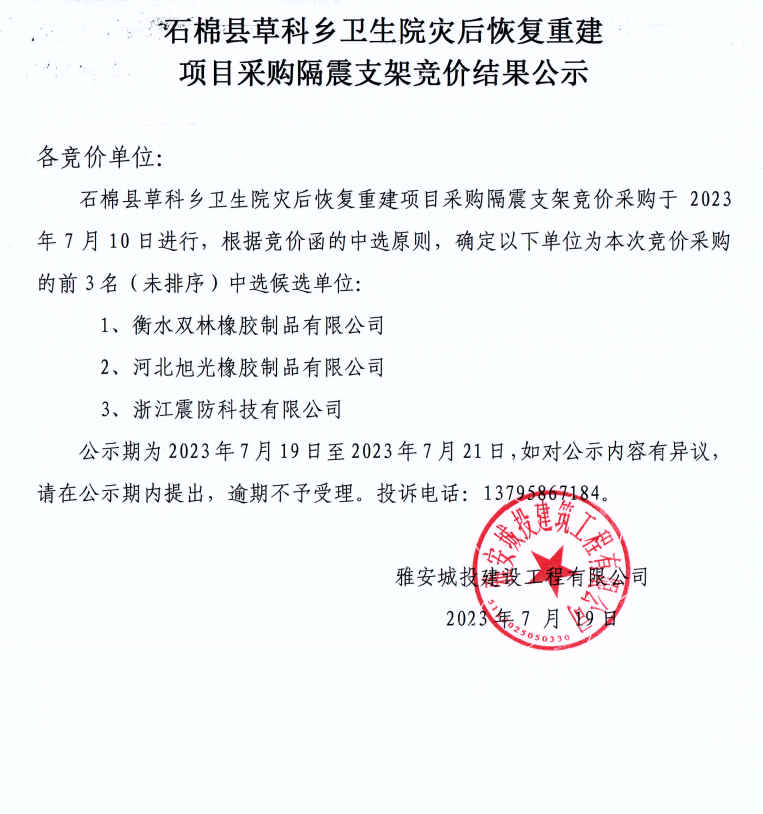 石棉縣草科鄉(xiāng)衛(wèi)生院災后恢復重建項目采購隔震支架競價結果公示