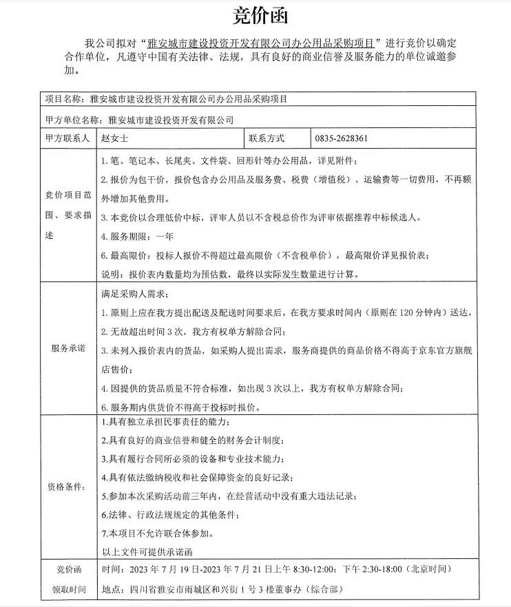 雅安城市建設(shè)投資開發(fā)有限公司辦公用品采購項目競價公告
