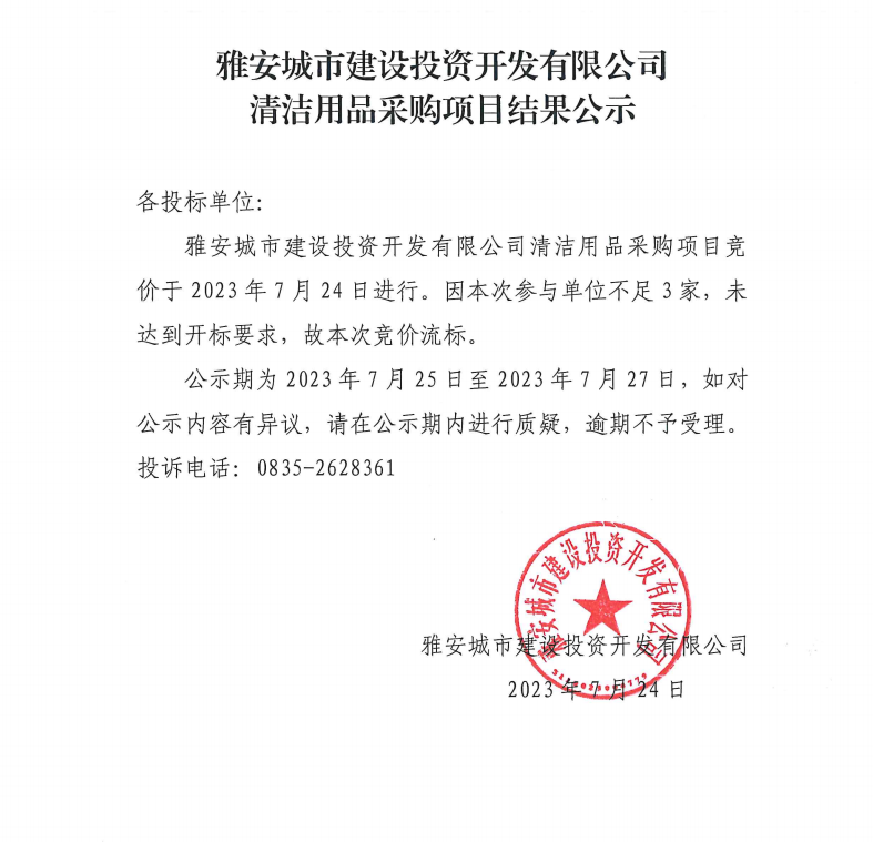 雅安城市建設(shè)投資開發(fā)有限公司清潔用品采購(gòu)項(xiàng)目結(jié)果公示