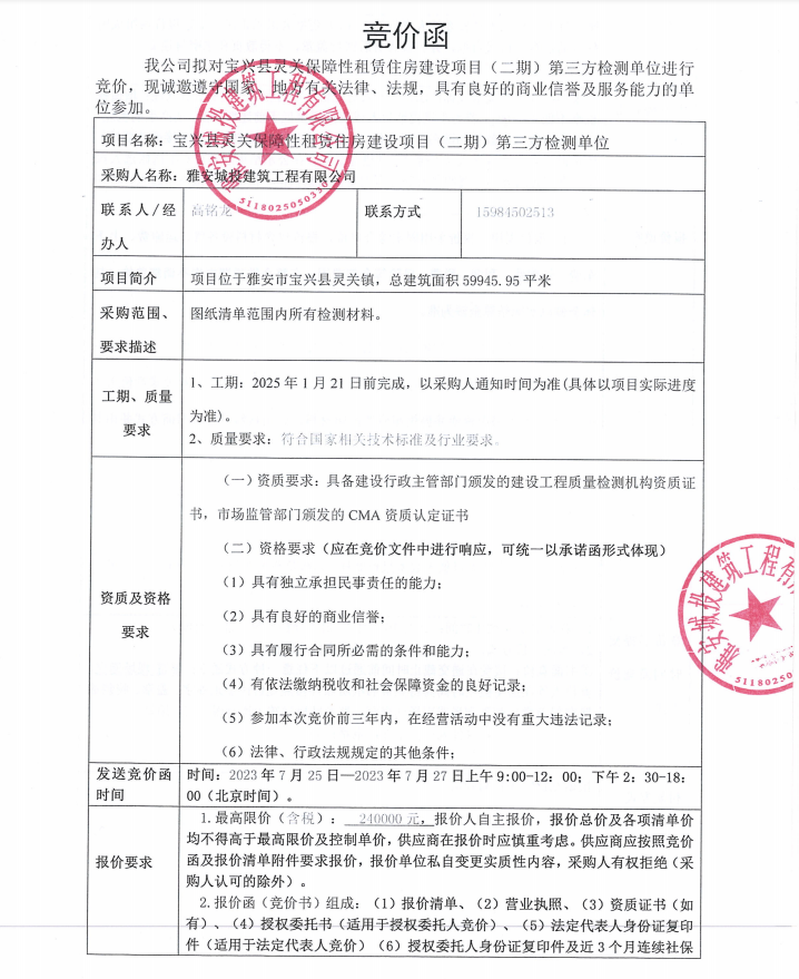 寶興縣靈關(guān)保障性租賃住房建設(shè)項(xiàng)目(二期)第三方檢測(cè)單位競(jìng)價(jià)公告