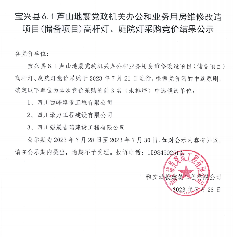 寶興縣6.1蘆山地震黨政機(jī)關(guān)辦公和業(yè)務(wù)用房維修改造項(xiàng)目(儲(chǔ)備項(xiàng)目)高桿燈、庭院燈采購競(jìng)價(jià)結(jié)果公示
