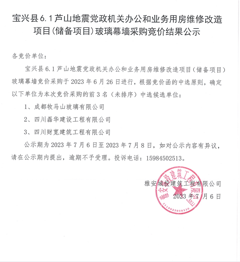 寶興縣6.1蘆山地震黨政機關(guān)辦公和業(yè)務(wù)用房維修改造項目(儲備項目)玻璃幕墻采購競價結(jié)果公示