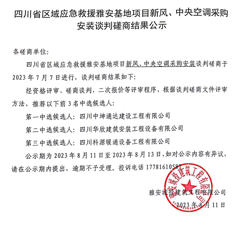 四川省區(qū)域應(yīng)急救援雅安基地項(xiàng)目新風(fēng)、中央空調(diào)采購安裝談判磋商結(jié)果公示