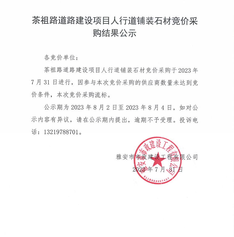 茶祖路道路建設(shè)項(xiàng)目人行道鋪裝石材競價(jià)采購結(jié)果公示