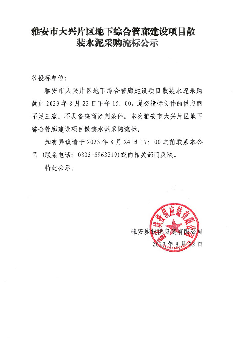 雅安市大興片區(qū)地下綜合管廊建設項目散裝水泥采購流標公示