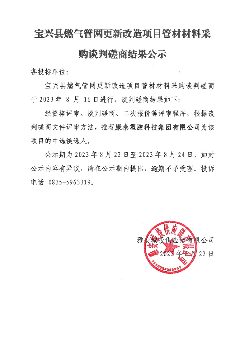 寶興縣燃?xì)夤芫W(wǎng)更新改造項(xiàng)目管材材料采購(gòu)談判磋商結(jié)果公示