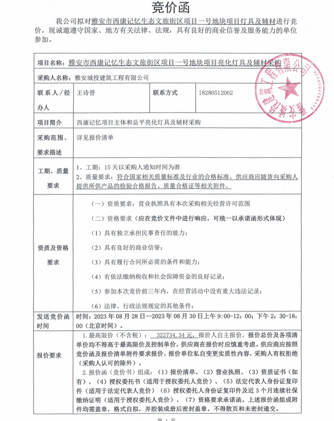 雅安市西康記憶生態(tài)文旅街區(qū)項(xiàng)目一號(hào)地塊項(xiàng)目燈具及輔材競價(jià)采購公告