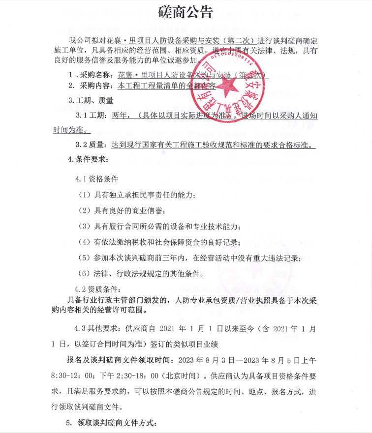 花襄·里項(xiàng)目人防設(shè)備采購(gòu)與安裝(第二次)談判磋商公告