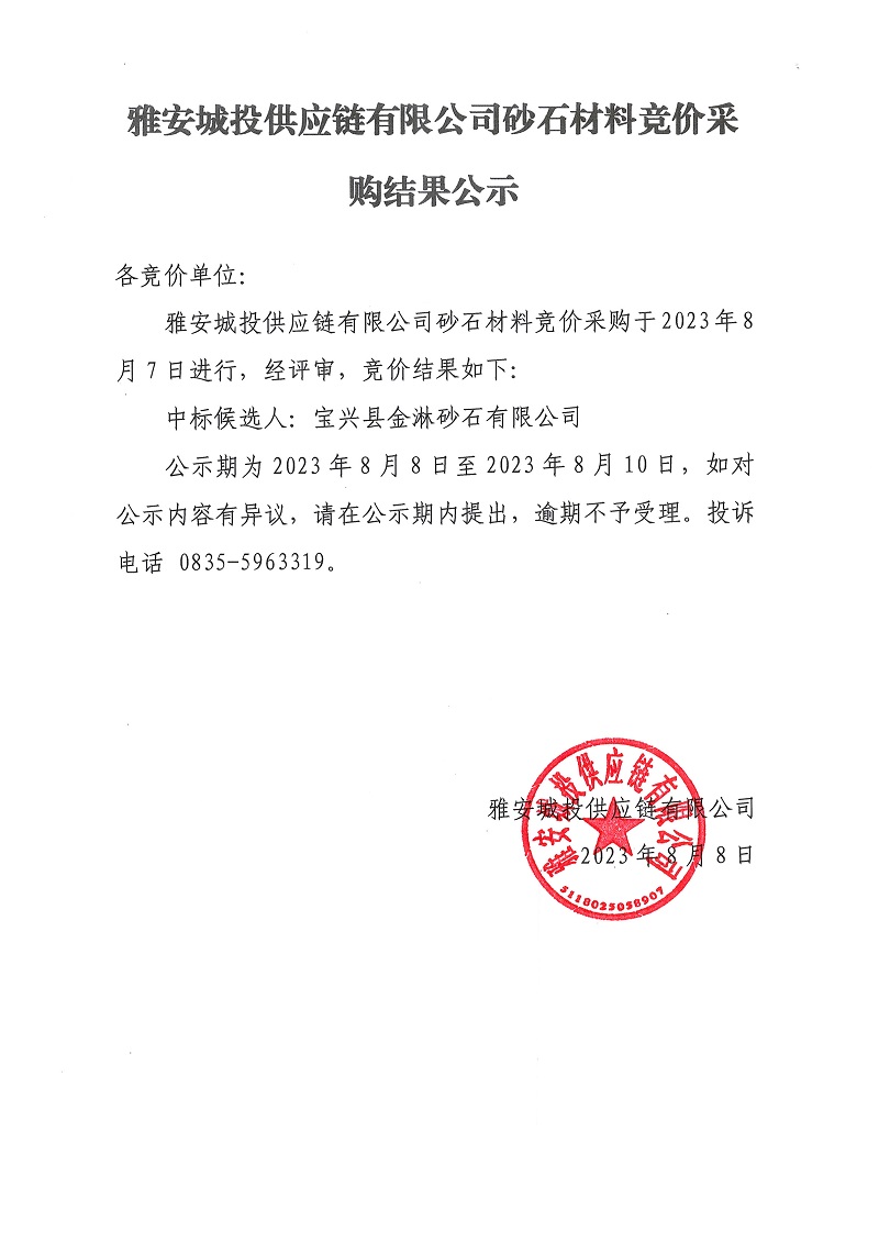 雅安城投供應鏈有限公司砂石材料競價采購結(jié)果公示