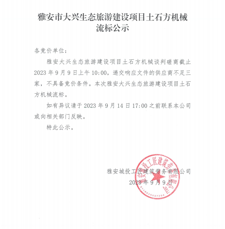 雅安市大興生態(tài)旅游建設(shè)項目土石方機械流標公示