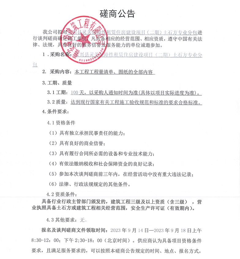 寶興縣靈關(guān)保障性租賃住房建設(shè)項(xiàng)目(二期)土石方專業(yè)分包談判磋商公告