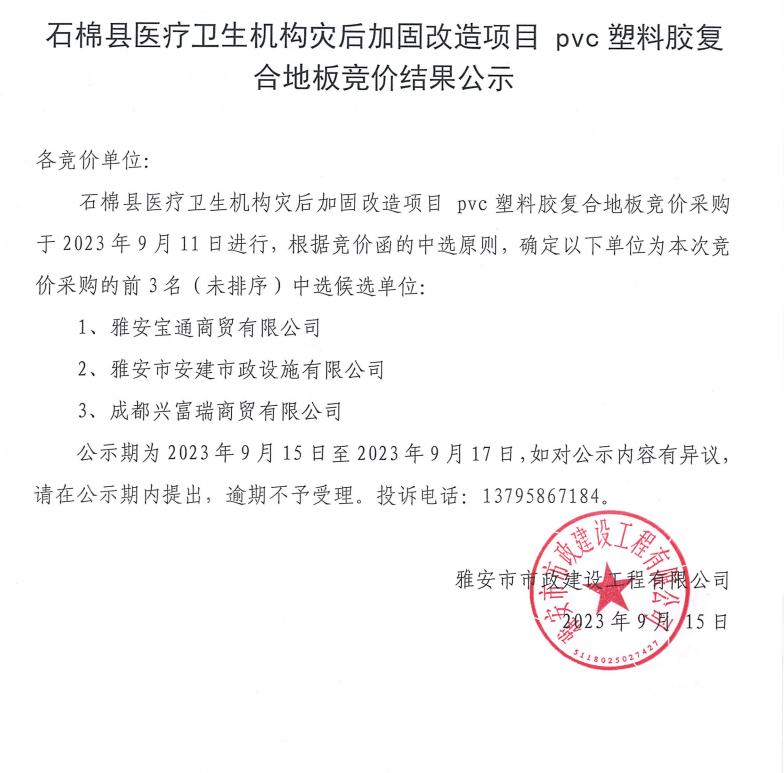 石棉縣醫(yī)療衛(wèi)生機構(gòu)災(zāi)后加固改造項目pvc塑料膠復(fù)合地板采購競價結(jié)果公示