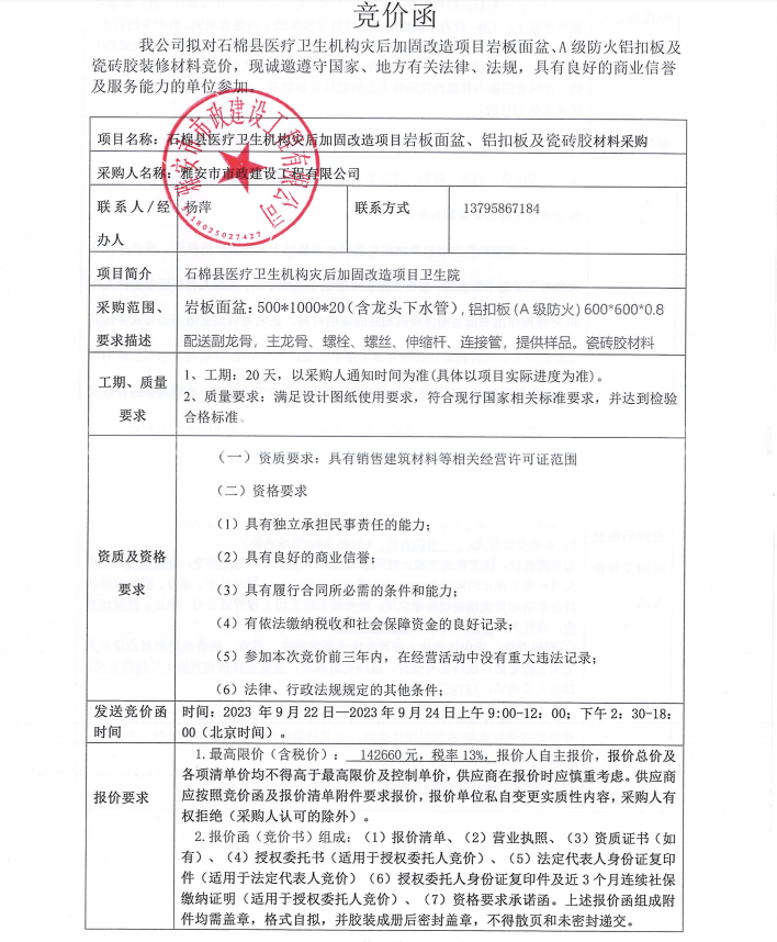 石棉縣醫(yī)療衛(wèi)生機構災后加固改造項目巖板面盆、A級防火鋁扣板及瓷磚膠材料采購競價公告