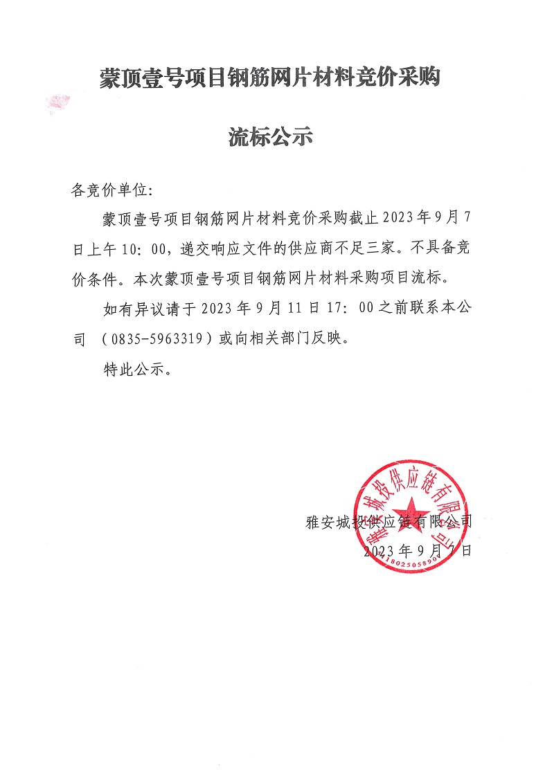 蒙頂壹號(hào)項(xiàng)目鋼筋網(wǎng)片材料競價(jià)采購流標(biāo)公示