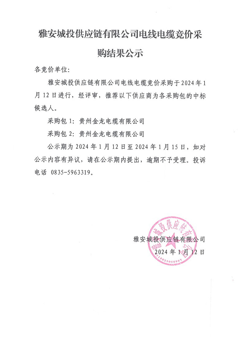 雅安城投供應(yīng)鏈有限公司電線電纜競價采購結(jié)果公示