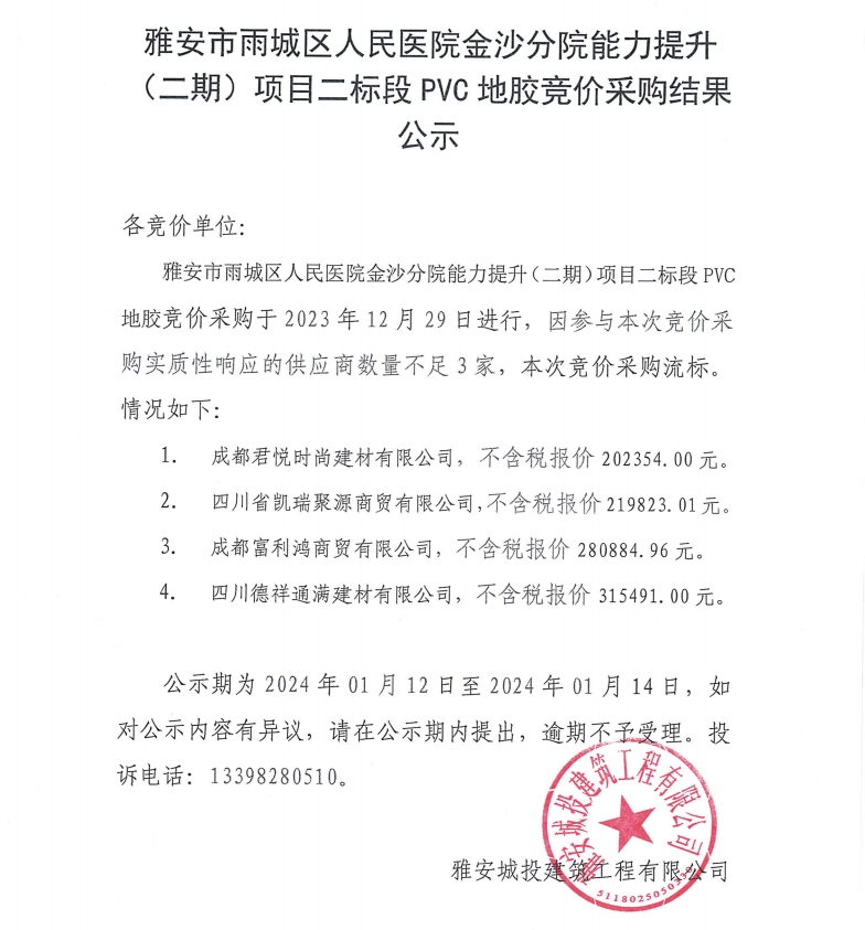 雅安市雨城區(qū)人民醫(yī)院金沙分院能力提升(二期)項(xiàng)目二標(biāo)段PVC地膠競(jìng)價(jià)采購結(jié)果公示