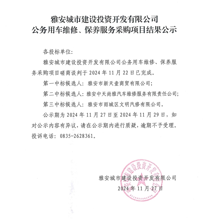 雅安城市建設(shè)投資開(kāi)發(fā)有限公司公務(wù)用車維修、保養(yǎng)服務(wù)采購(gòu)項(xiàng)目結(jié)果公示