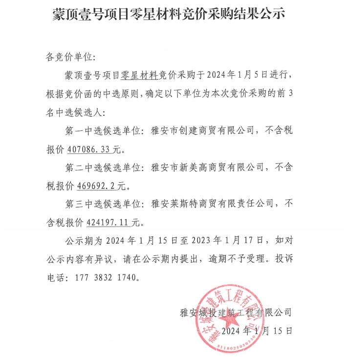 蒙頂壹號項目零星材料競價采購結(jié)果公示